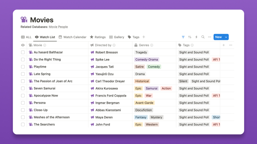 Keep track of the films you watch, plan your next viewing, and explore the work of your favorite directors and actors in one place. This movie notebook template for Notion gives you a structured way to organize movie notes, ratings, and recommendations.
