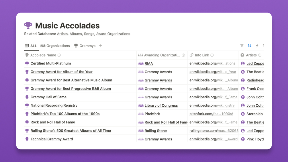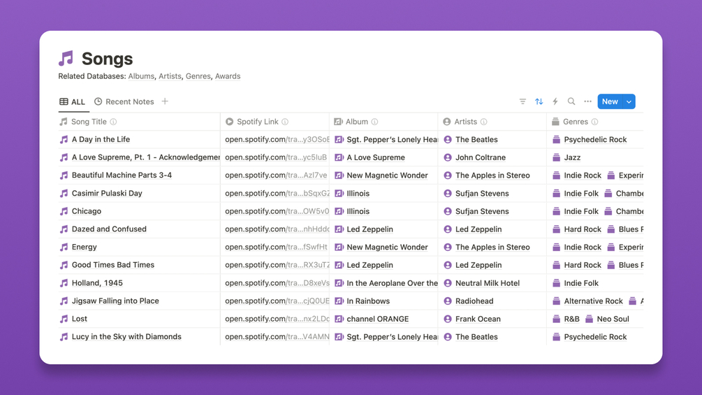 Keep track of albums, songs, artists, and playlists all in one place with this music notebook template for Notion. This template helps you stay organized and deepen your musical knowledge, whether you’re cataloging your favorites, exploring new music, or documenting concert experiences.